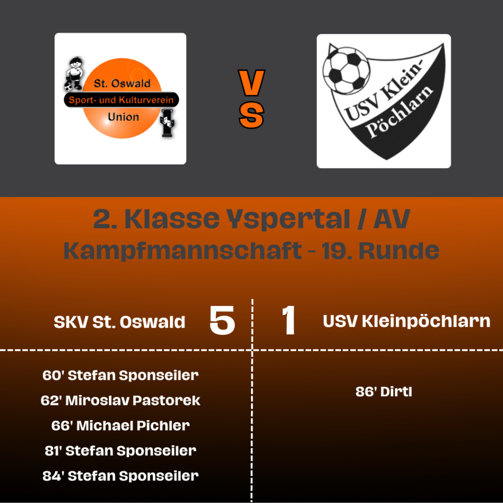 Die Kampfmannschaft konnte aber wie geplant um 19:00 Uhr auflaufen. Die gesamte 1. Spielhälfte kamen wir aber nicht wirklich ins Spiel und zeigten eigentlich eine ziemlich schwache Leistung. Viele Fehlpässe und eine Grundnervosität prägten leider unser Spiel. Nach der Pause wurde unsere Leistung aber grundlegend besser und somit gingen wir in der 60. Minute durch Stefan Sponseiler in Führung. Bereits ein paar Minuten zuvor holte sich ein Kleinpöchlarn-Spieler in der selben Situation zwei Mal die Gelbe Karte und schwächte dadurch sein eigenes Team. Wir kamen im Gegenzug zu immer mehr Chancen. Ein Weitschuss von Miroslav Pastorek (62′), ein Kopfball von Michael Pichler (66′) und zwei weitere Tore durch Stefan Sponseiler (81′ / 84′), der dadurch den Dreierpack perfekt machte, bescherten uns einen eindeutigen und auch verdienten Heimsieg. Einzig der Gegentreffer in der 86. Minute hätte bei diesem Spielstand nicht mehr passieren dürfen.